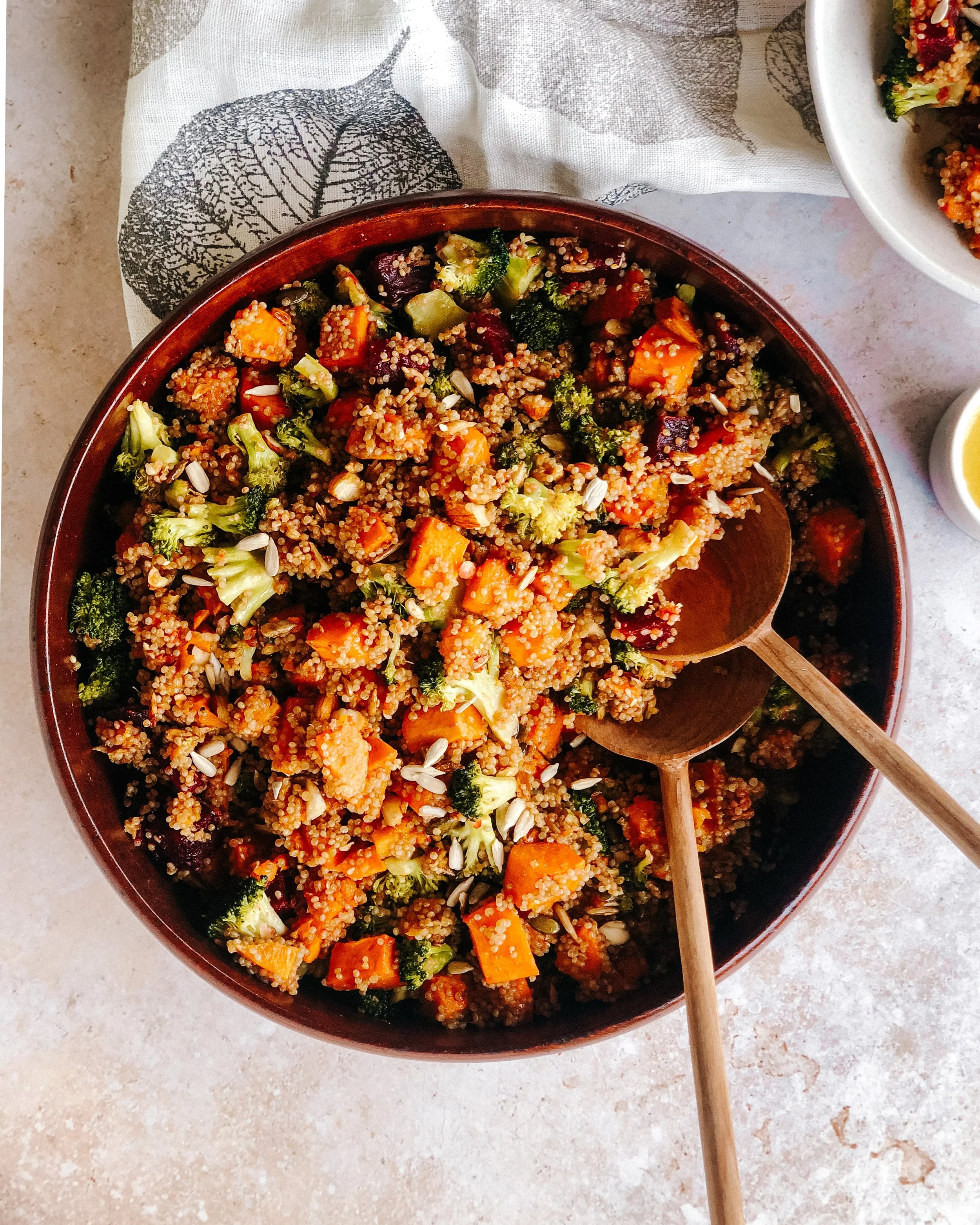 While these are roasting cook quinoa and make the dressing by mixing the ingredients together in a jar or bowl.