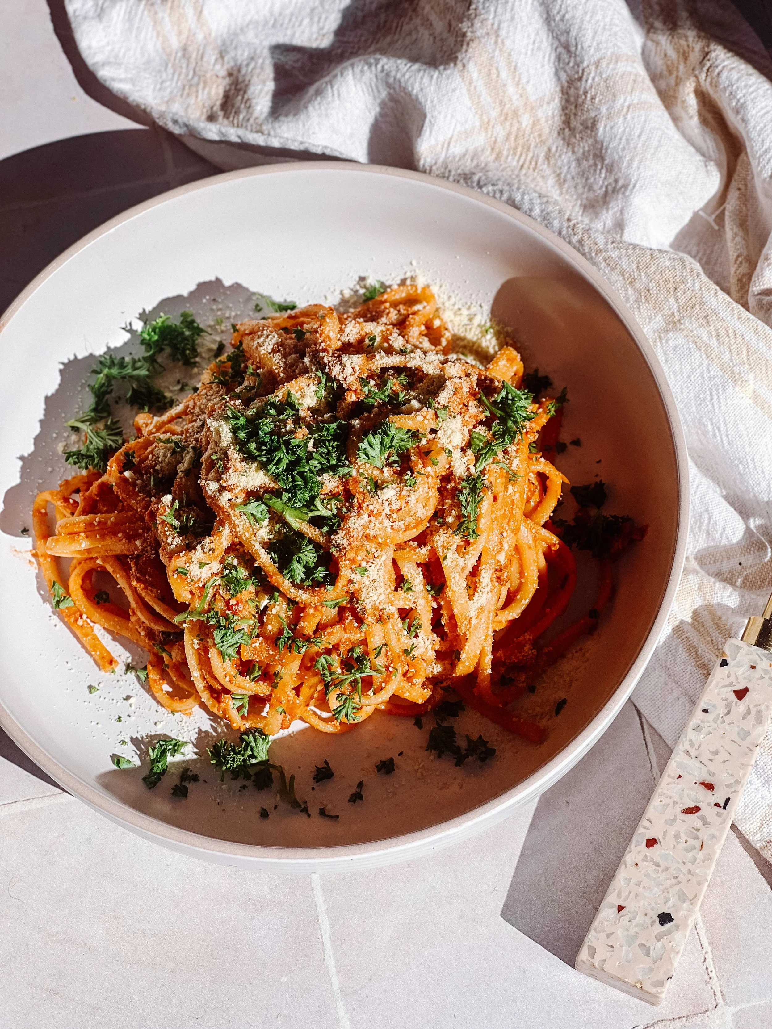 For the chorizo pasta, fry off onion & garlic then add tofu chorizo and parsley. Add passata, tomato paste, nutritional yeast, balsamic, chilli flakes and simmer for 10 minutes on low to reduce and thicken. Season with salt & pepper. Add cooked pasta to sauce and mix through.