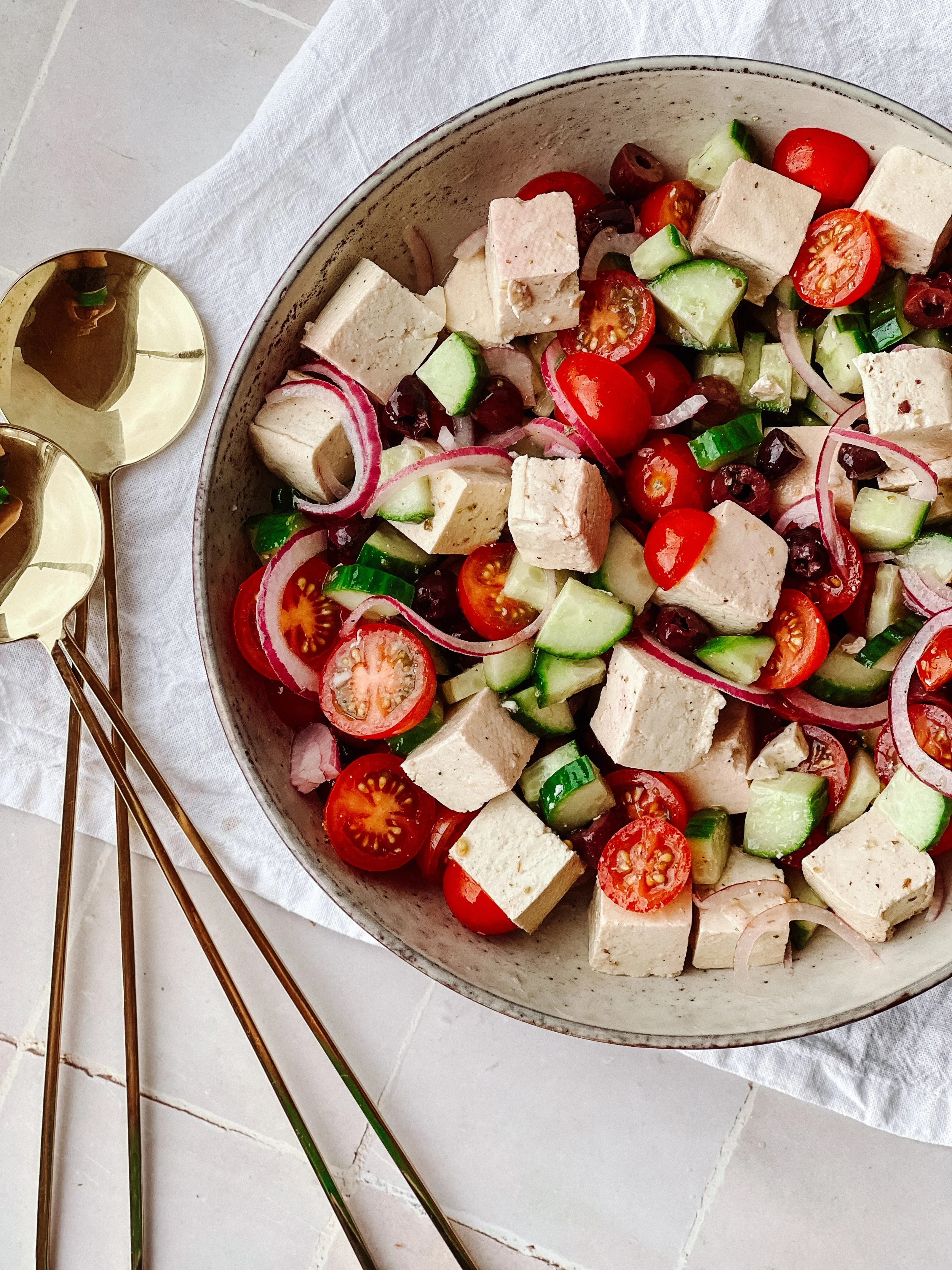 My vegan take on Greek Salad. So fresh and pretty damn close to the real deal!
